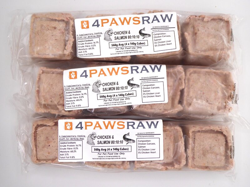 Premium Chicken & Salmon 80/10/10 Mince frozen dog and cat food. 560g pack split into 4 x 140g cubes for easy defrost and portion control.