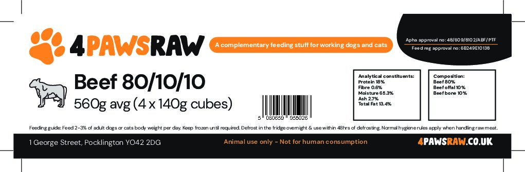 Premium Beef *’Complete’ 80/10/10 in 560g packs (4 x 140g blocks). Frozen Dog Food with DELIVERY UK Wide